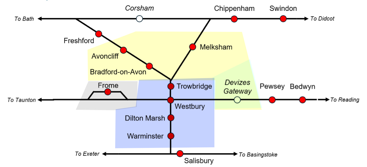 The map at the head of this post comes from the Wiltshire Rail Strategic Study. I have shaded the area covered by the West Wiltshire Rail User Group. In yellow, you have the three West Wiltshire stations in the Melksham and Devizes parliamentary constituancy. In blue, the four West Wiltshire stations in the South West Wiltshire constituency.