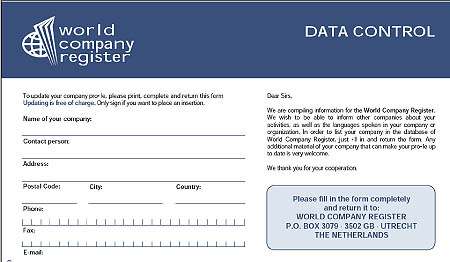"Updating is free of charge" says the email ... but read the fine print and you'll see that submitting information and signing it commits you to a spend of 995 euros per year for three years. Curiously, the fine print wasn't very legible to me, so I've extracted the text to help you read it, and taken it out of "all caps" ... here's their text, reproduced here for critical review:| The signing of this document represents the acceptance of the following conditions and the conditions stated in the terms and conditions for insertion on web page www.worldcompanyregister.com. The signing is legally binding and gives you the right of an insertion in the online database of The World Company Register, which can be accessed via the internet, and a cd rom with worldwide businesses is granted, all in accordance with the contract conditions stated in the terms and conditions for insertion on web page www.worldcompanyregister.com. The validation time of the contract is three years and starts on the eighth day after signing the contract. The insertion is granted after signing and receiving this document by the service provider. I hereby order a subscription with service provider international directories group ltd world company register. I will have an insertion into its database for three years. The price per year is euro 995. The subscription will be automatically extended every year for another year, unless specific written notice is received by the service provider or the subscriber two months before the expiration of the subscription. Your data will be recorded. The place of jurisdiction in any dispute arising is the service provider's address. The agreement between the service provider and the subscriber is governed by the conditions stated in the terms and conditions for insertion on web page: www.worldcompanyregister.com |